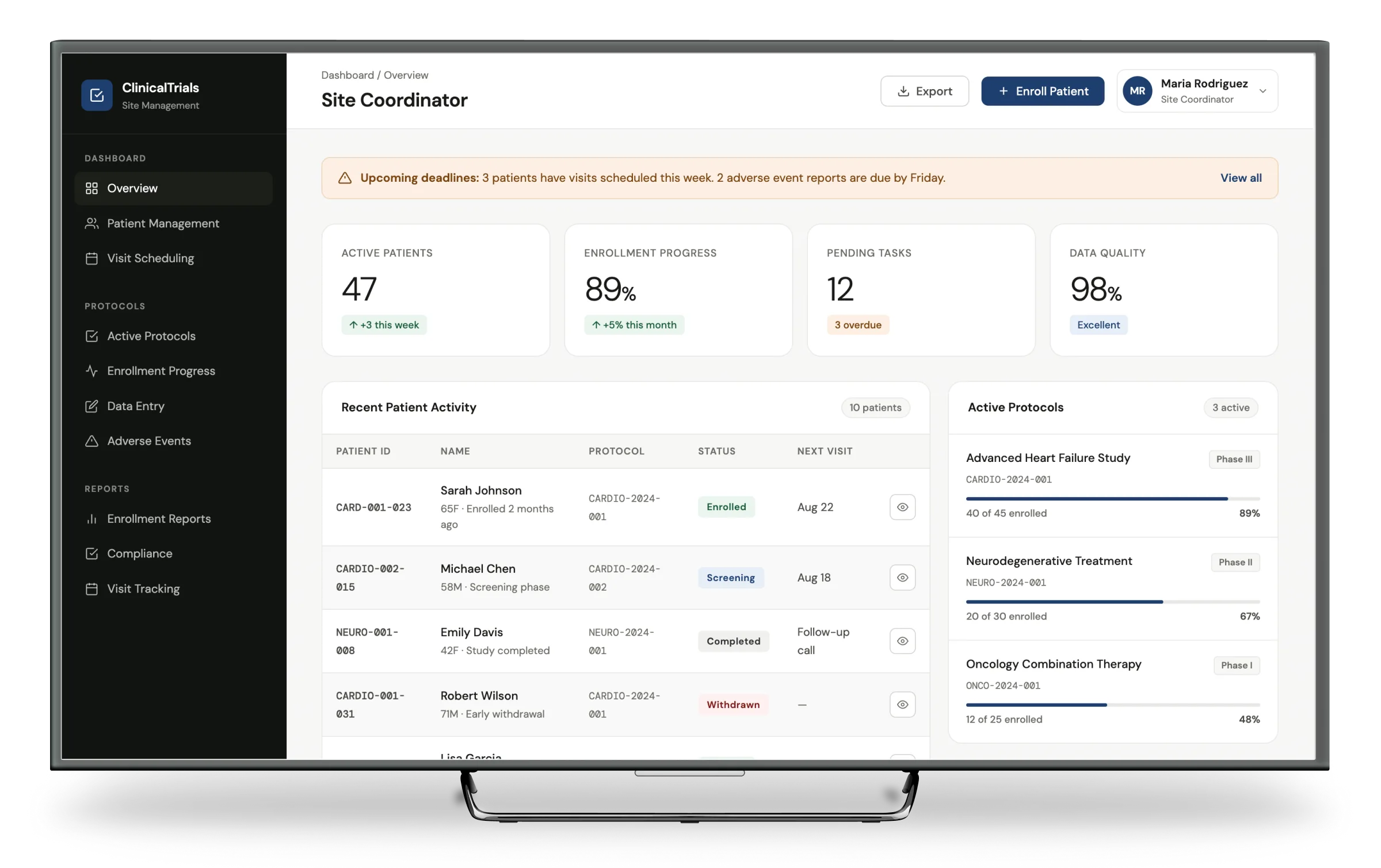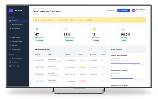 As the first design hire, directed the complete transformation of the clinical trials portal serving site coordinators, CROs, and sponsors. Built design systems and research foundations from the ground up while transforming fragmented workflows into a unified experience.